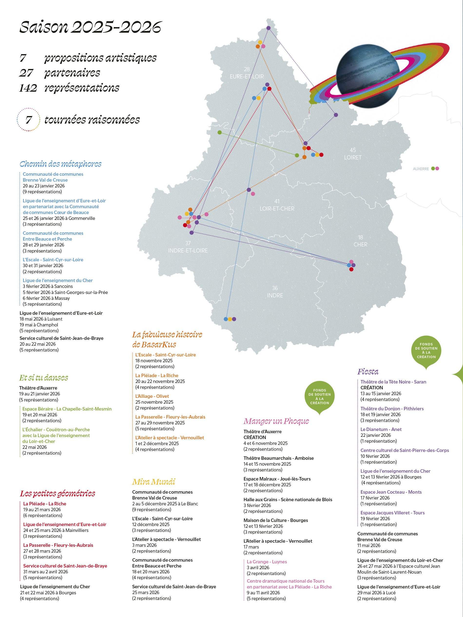 La scène nomade art, enfance et jeunesse élabore une programmation accueillie dans les lieux partenaires qui souhaitent coopérer autour d’un projet jeune public structurant à l’échelle du réseau.